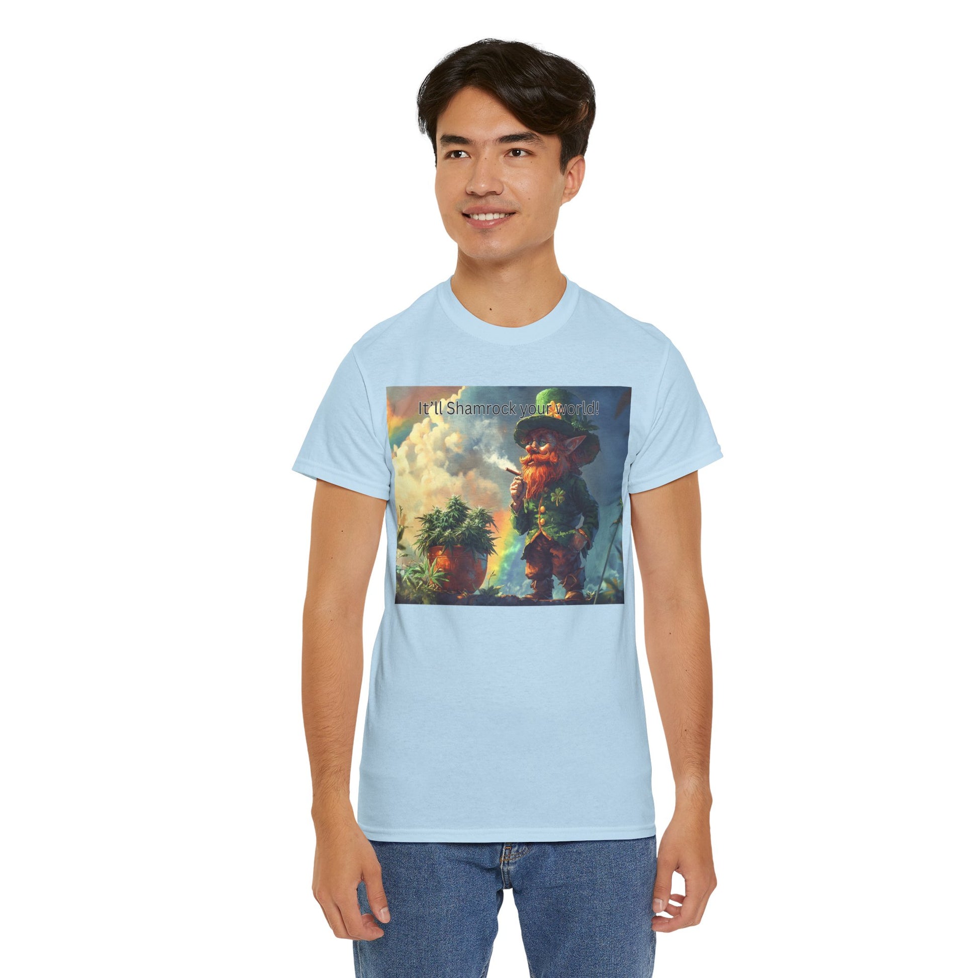 This St. Patrick's Day funny tee with a marijuana theme features a playful play on rainbow and pot of gold design. Perfect for those looking for a humorous and festive shirt to wear during the holiday season. Suitable for adults.